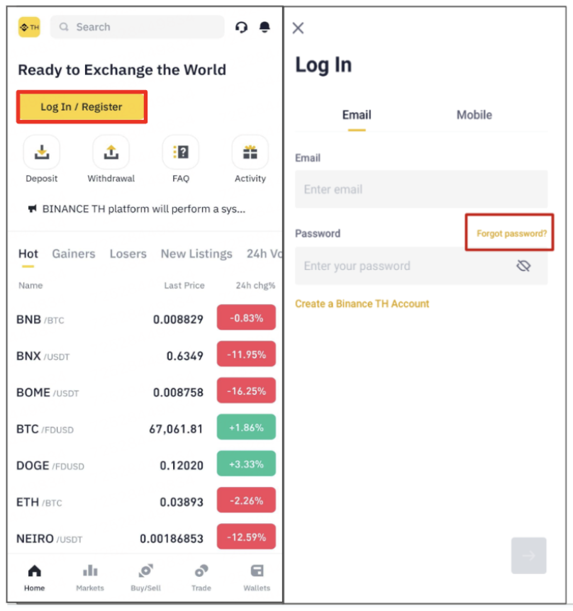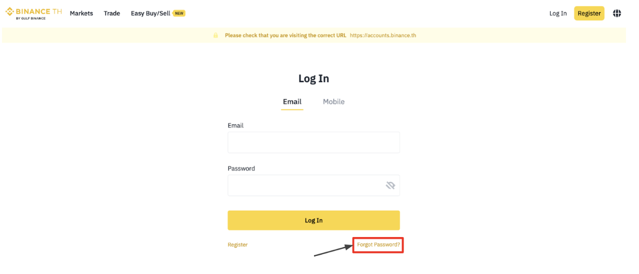 1. Go to Binance TH and click [Log In / Register] button, and then click [Forget Password].