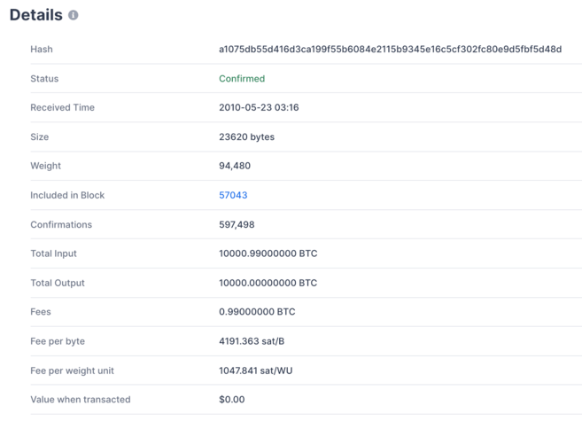 a1075db55d416d3ca199f55b6084e2115b9345e16c5cf302fc80e9d5fbf5d48dCopying the transaction hash into the search field of the Bitcoin blockchain explorer will take us to the Pizza Day transaction. If you don’t want to copy-paste the details, here is a link to the transaction page.