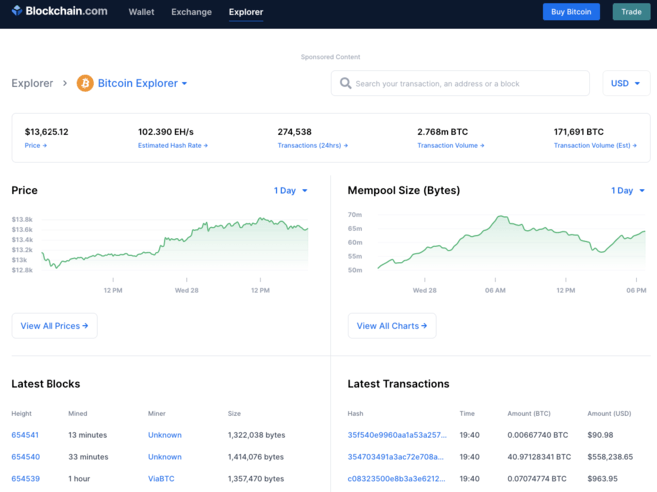 On the front page, you can see some high-level data about the Bitcoin blockchain. This includes the price, estimated hash rate, daily number of transactions, and transaction volume. We also see charts mapping price and mempool size. At the bottom, we can monitor the latest blocks and transactions.
