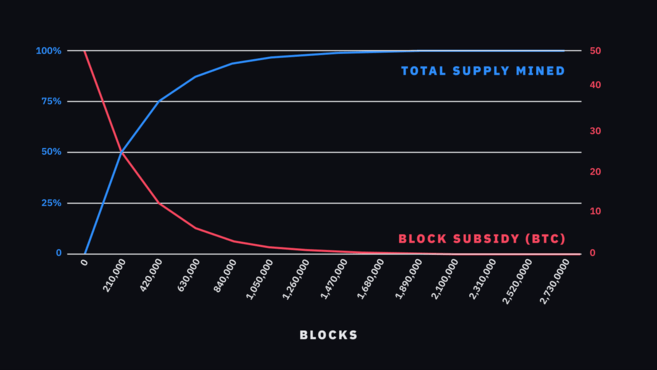 BTC Total Supply Mined (%) and Block Subsidy (BTC).