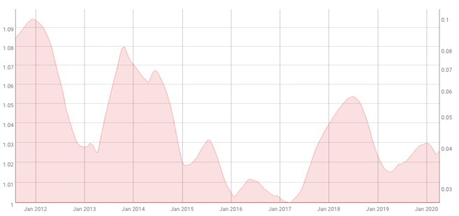 200-day Moving Average of 180-day Volatility of Bitcoin. Source: Coinmetrics.io