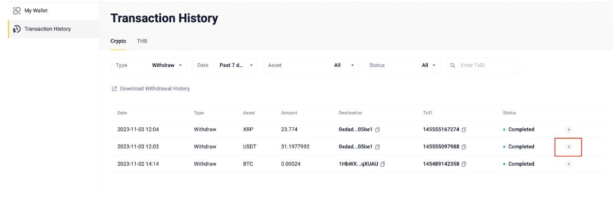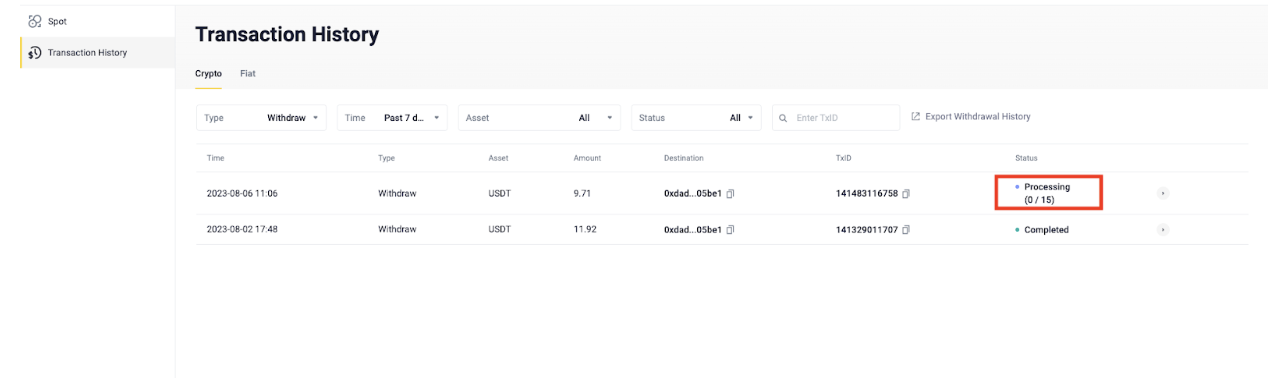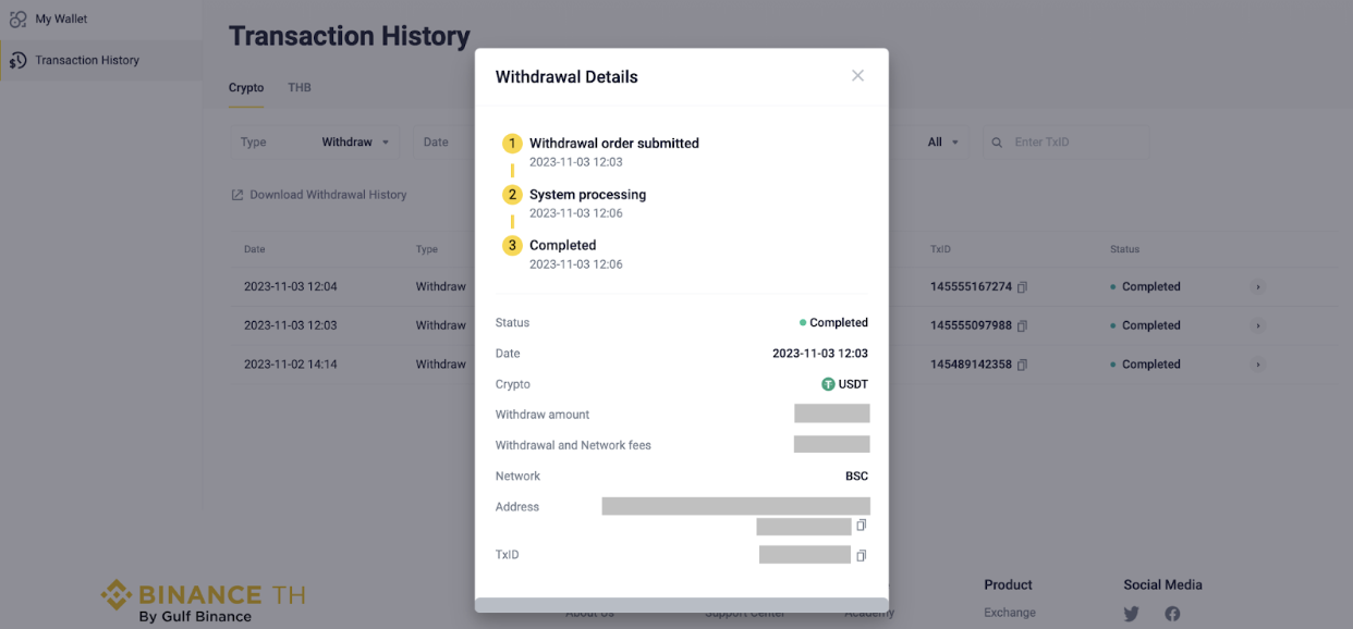 Log in to your BINANCE TH account and click [Wallet] - [Transaction History] to view your cryptocurrency withdrawal record. If the [Status] shows that the transaction is “Processing”, please wait for the confirmation process to be completed.