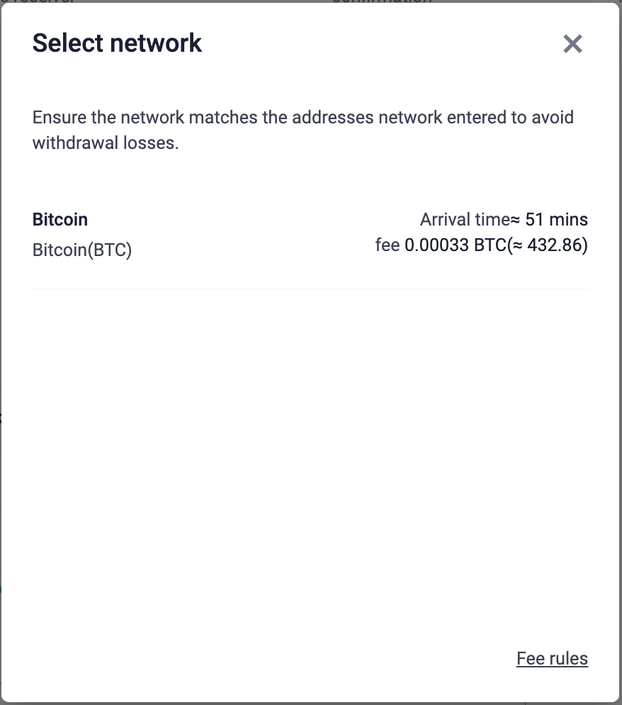 4. Select the network. Depending on the crypto you choose, you will see the corresponding supported networks and network fees for this transaction. Please make sure that the network matches the address entered. If you select the wrong network, your funds might be lost and couldn’t be recovered.