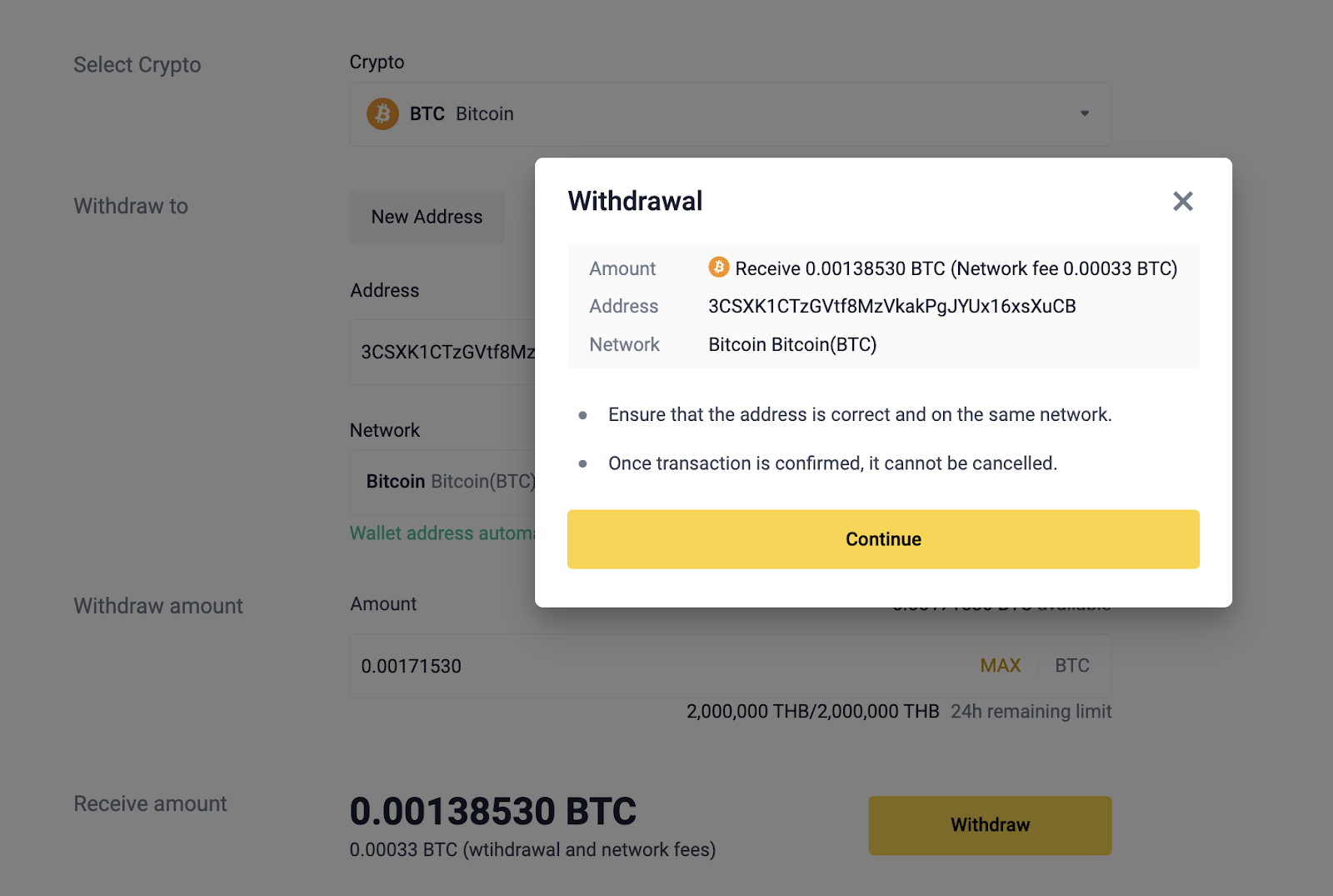 7. Check the withdrawal details carefully. Click [Continue] and verify the transaction with your 2FA devices.