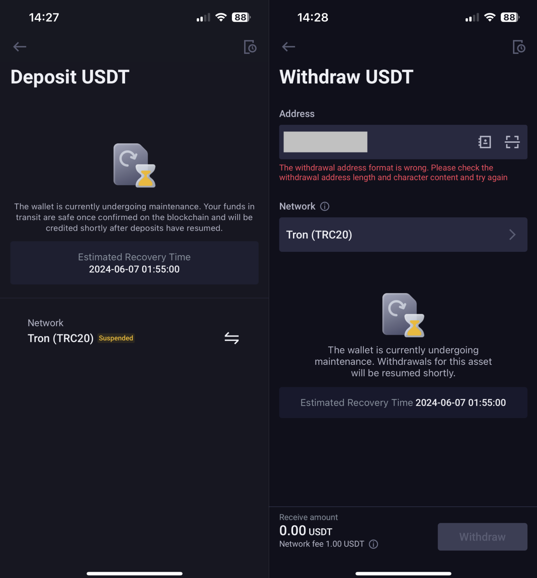 If the network you want to use is in maintenance, you will see a message displayed on the screen notifying you that the system is undergoing maintenance. During a wallet maintenance, you’ll see the following suspension messages below for withdrawal/deposit on the App and Website.