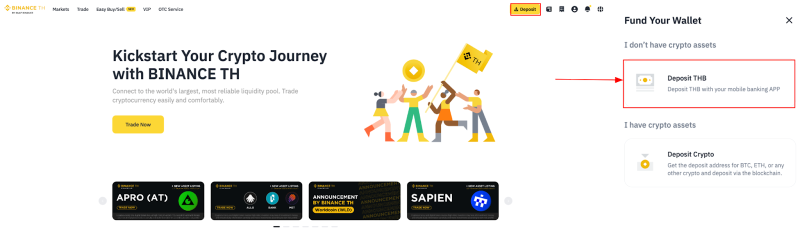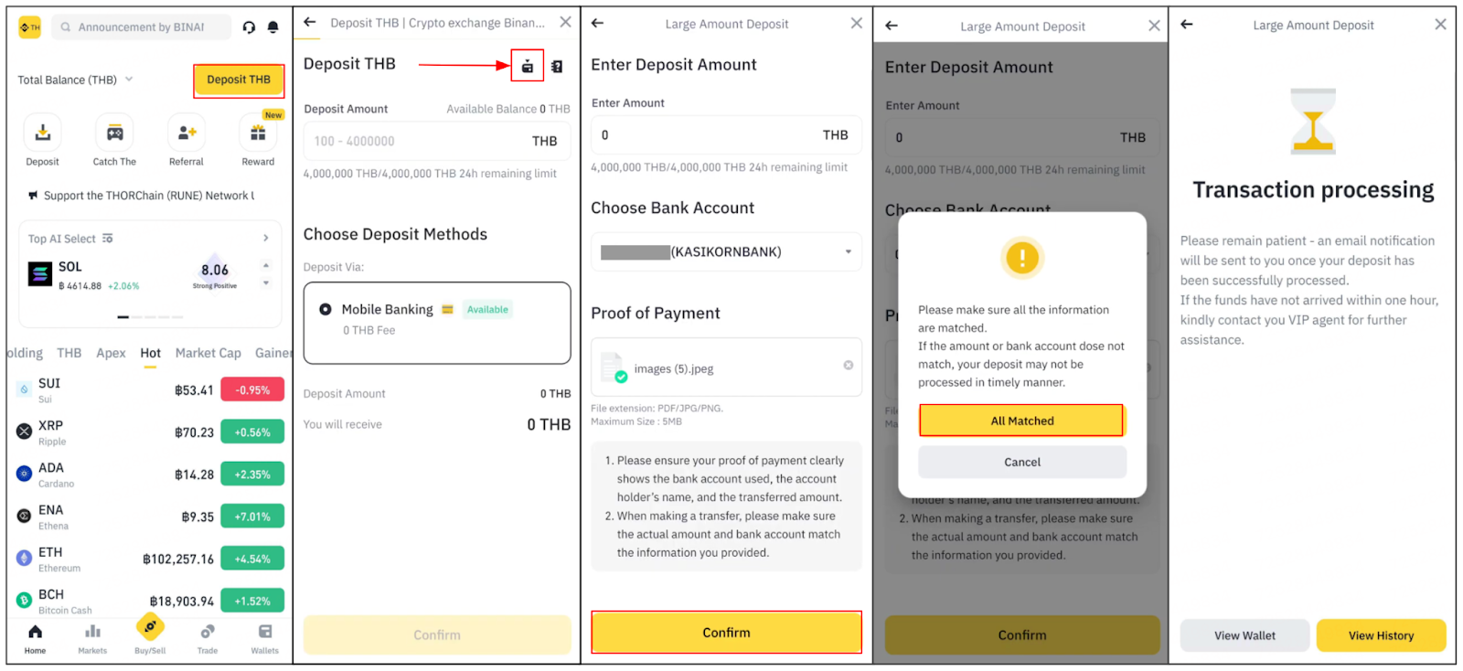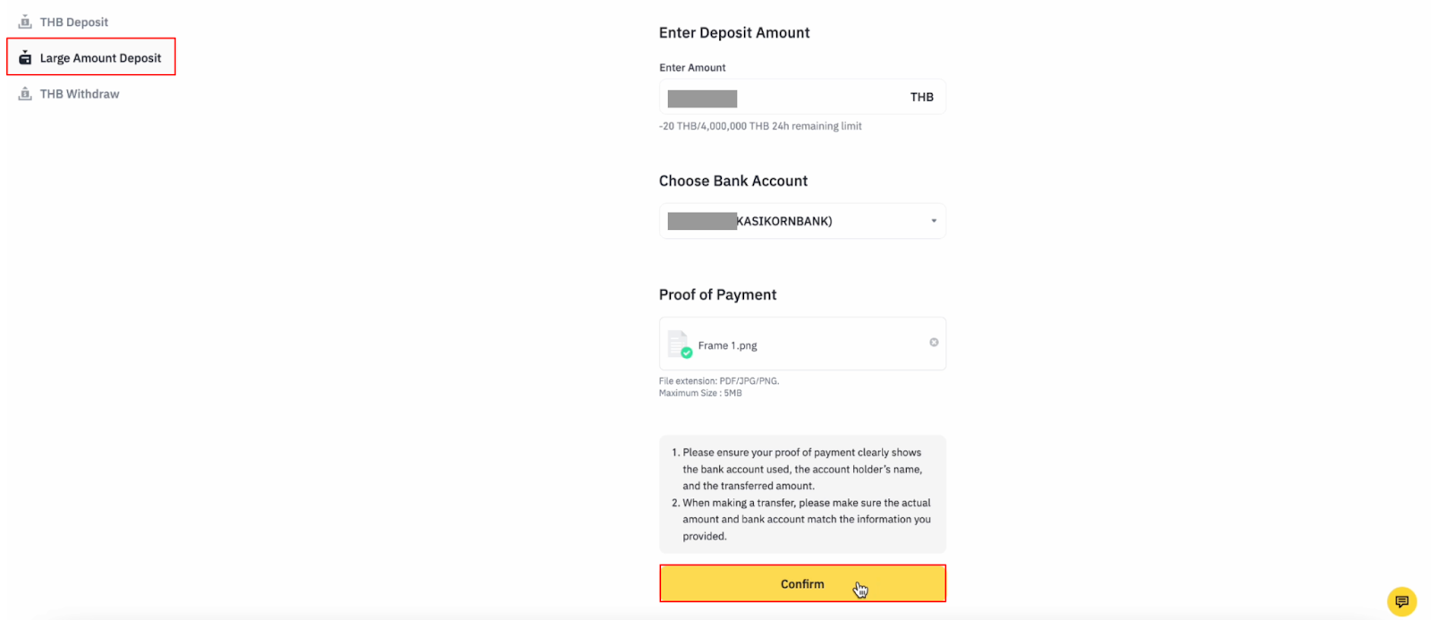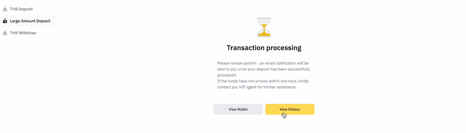 The Large Amount Deposit menu allows you to deposit Thai Baht (THB) into your Binance TH account via bank transfer more easily. This feature is available only to users whose accounts have been enabled for this function. If you wish to use this feature, please contact our Customer Support to check the requirements and request activation. Once your account is enabled for the function, you can follow the steps in this article to complete your deposit.