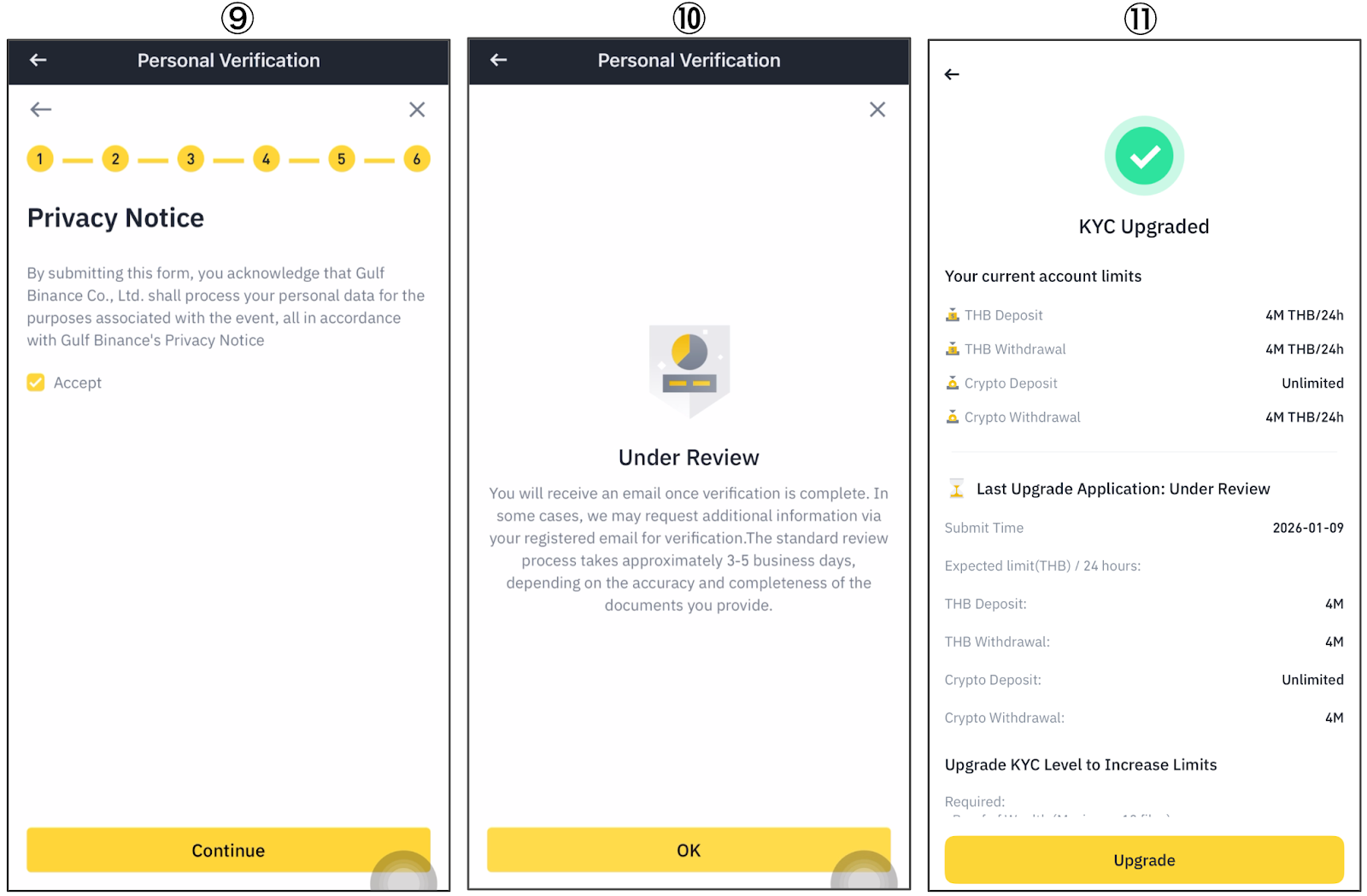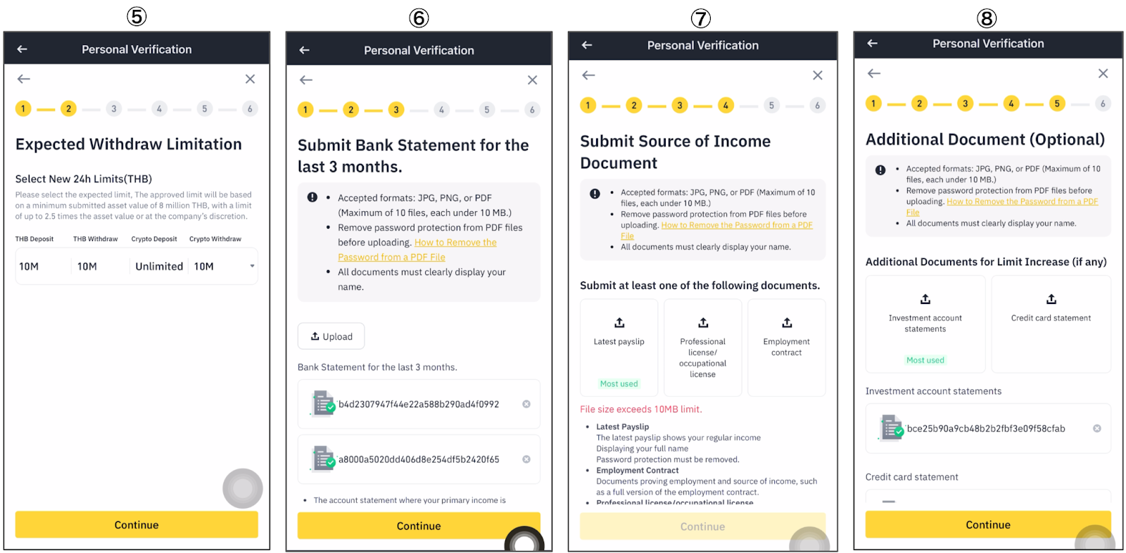 To request an upgrade in the daily withdrawal limit, users must submit the required documents here, or via the Binance TH application or website, by following these steps: