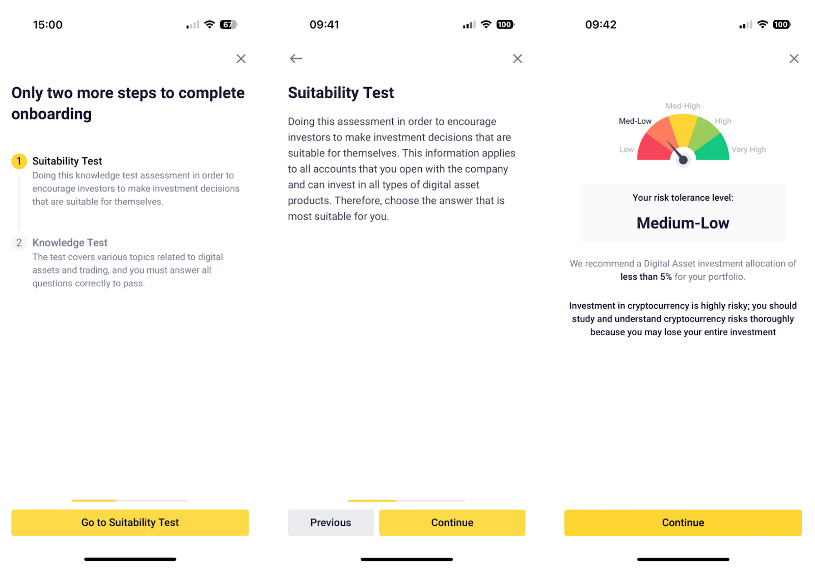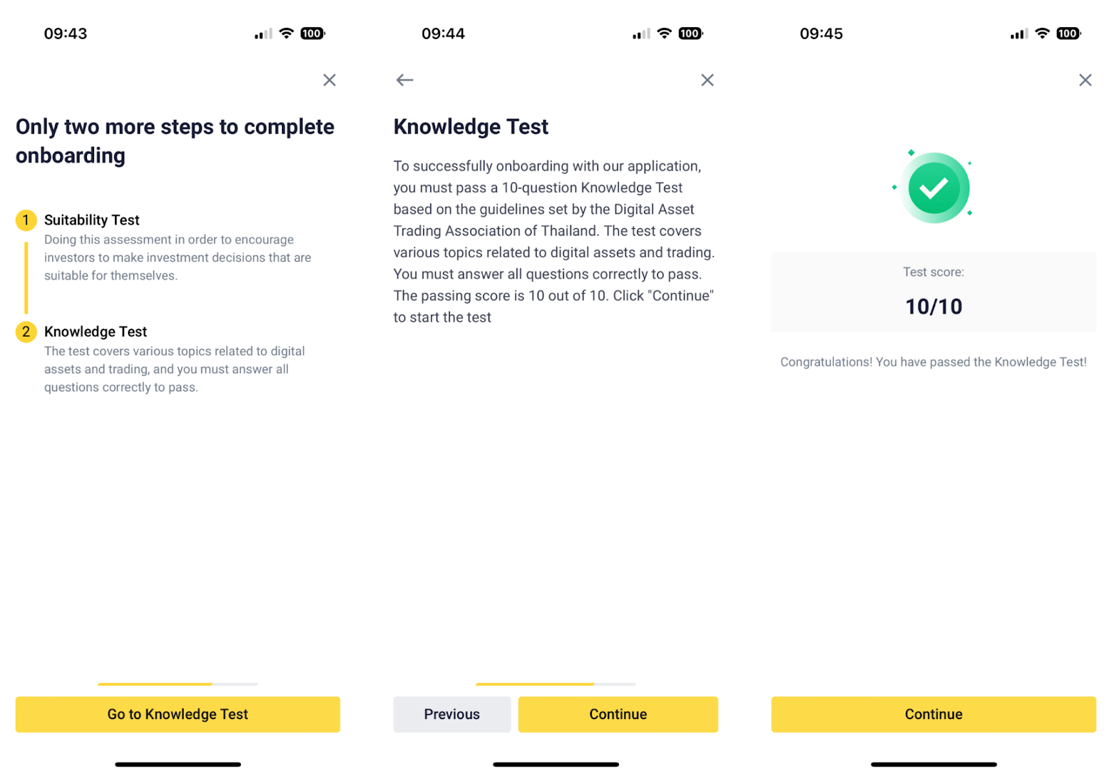 9. Next, complete onboarding testing process; Suitability Test and Knowledge Test