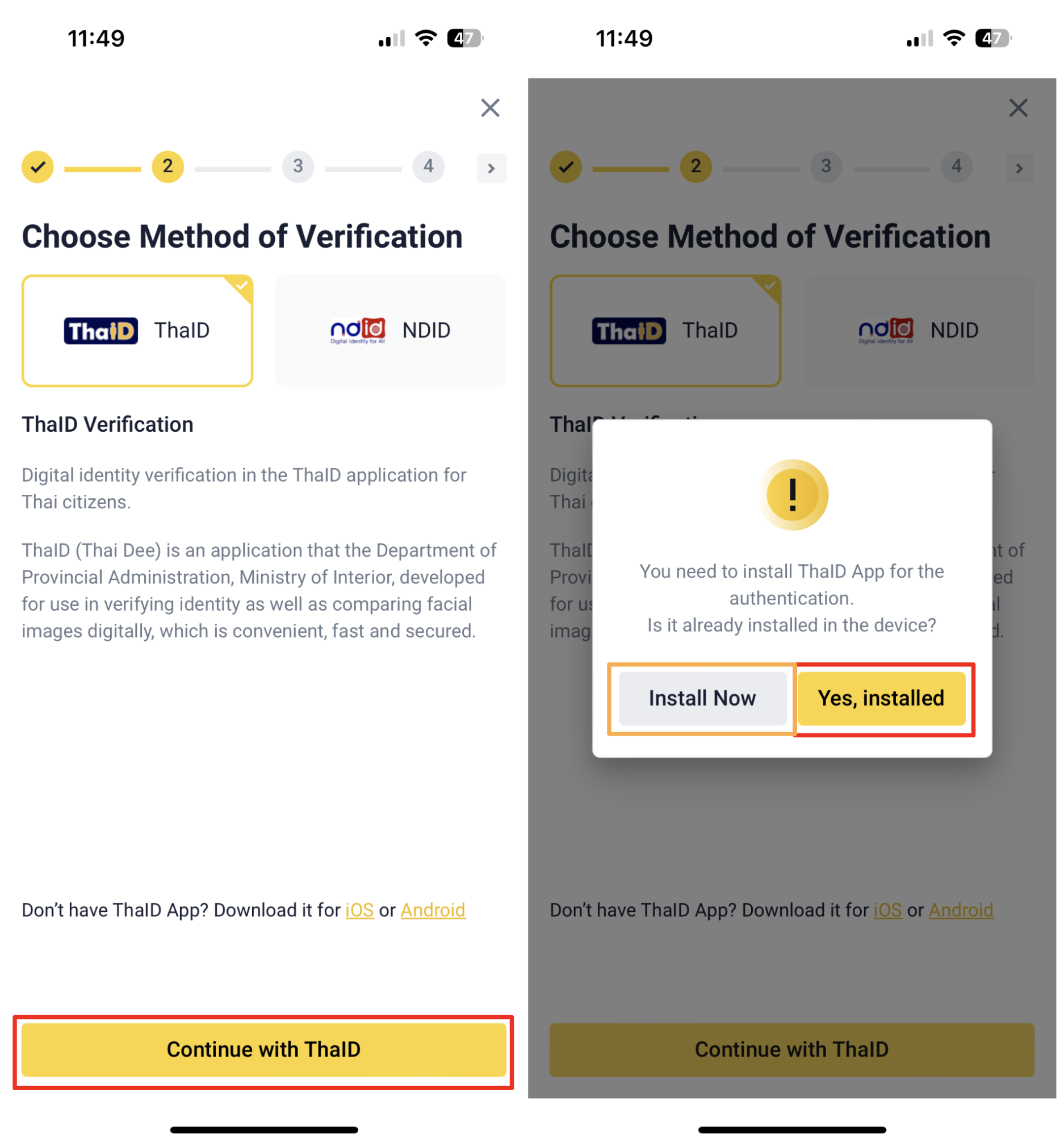 Before you click [Continue with ThaID], you're required to install the ThaID app, and register an account with ThaID first. Then, return to BINANCE TH app, click [Yes,Installed and [Continue with ThaID] for the verification via ThaID.