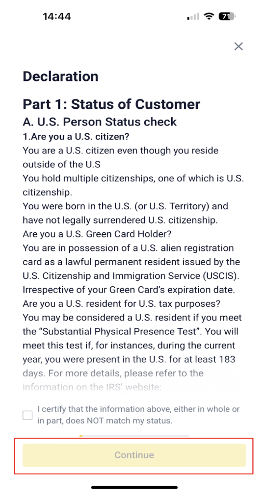 2. After verifying and declaring your status as a U.S. or non-U.S. person, click [Continue] and check the Declaration status box.
