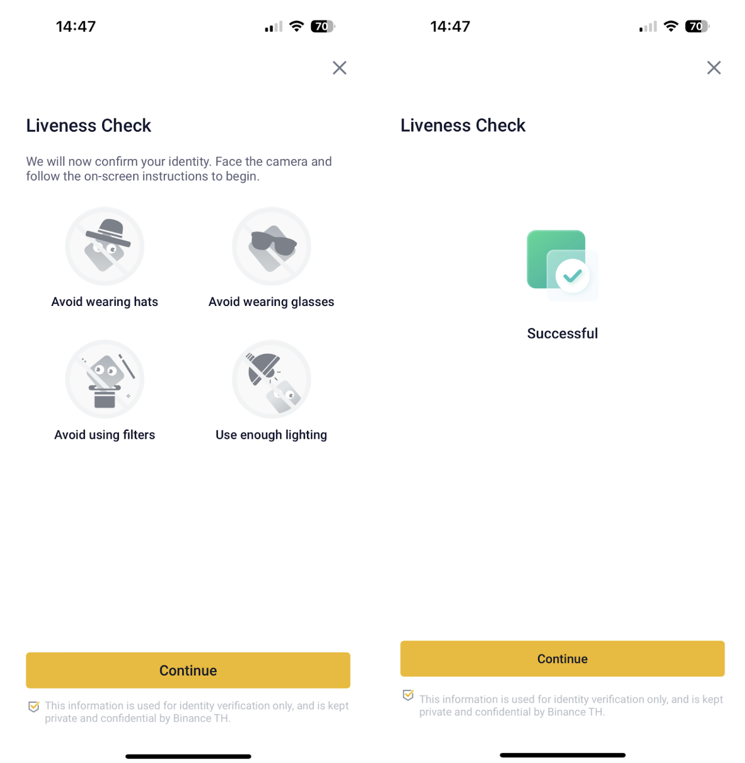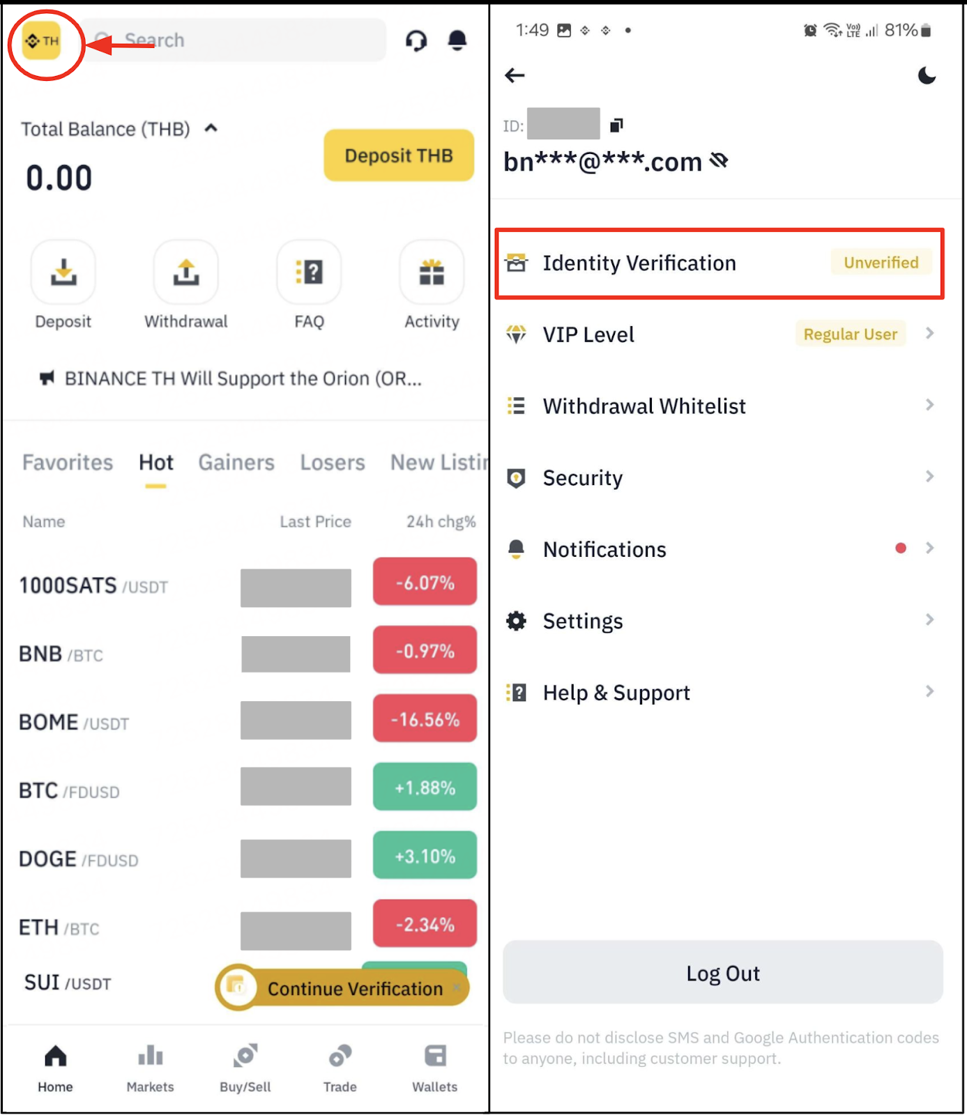 Log in to your BINANCE TH account and click [Profile] - [Unverified] or click on [Verify Identity] floating button on the main page. When you reach the screen, you'll be asked to confirm the verification click [Verify] to continue