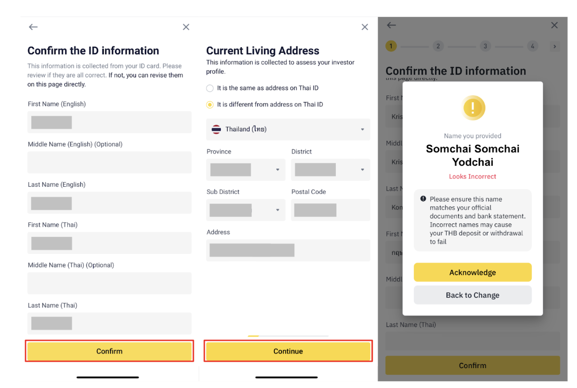 4. Check your ID card information to ensure it is correct. Both Thai and English Please ensure that all information provided corresponds with your identity document. Once confirmed, you cannot make changes. Then click [Continue]. If there is a duplicate between your first name, middle name, and/or lastname, a pop-up message will appear asking you to review your information again. You can click [Acknowledge] to proceed or [Back to change] to update your details.