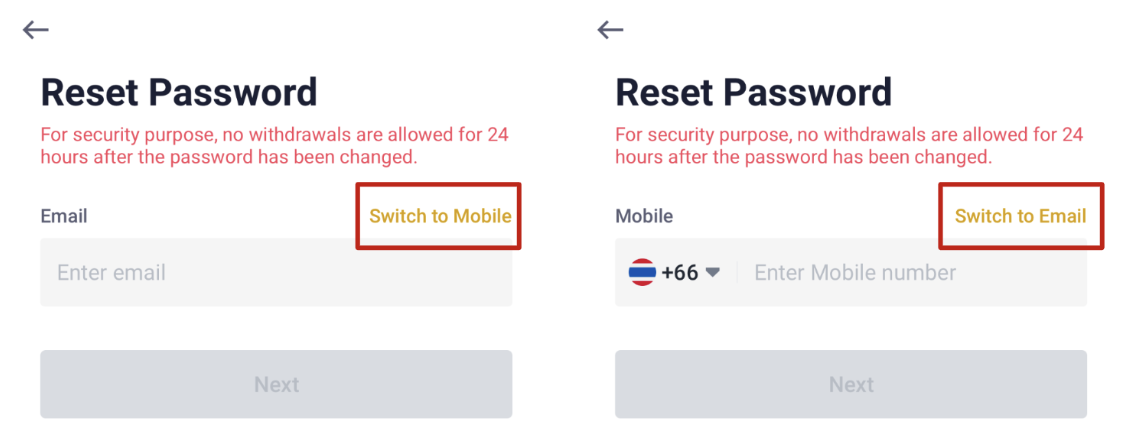 2. By clicking [Switch to Email] or [Switch to Mobile], you can choose the Reset Password method to receive a verification code via your mobile number or email.