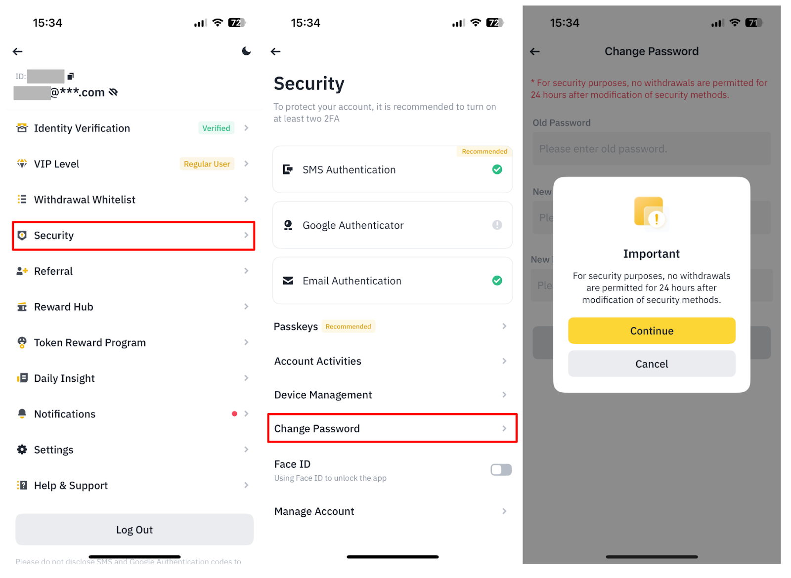Go to BINANCE TH profile then click [Security] - [Change Password]. Click [Continue] to process the next step.