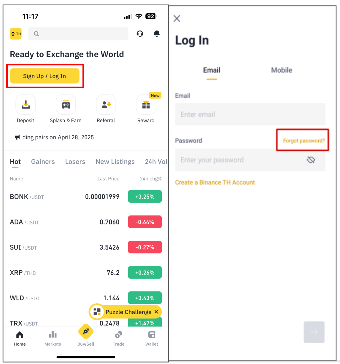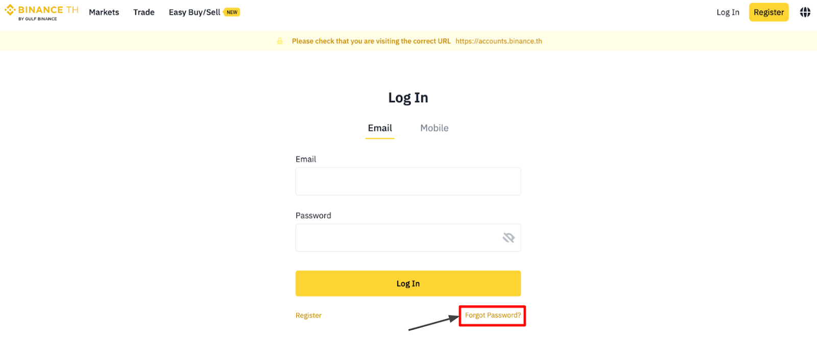 1. Go to BINANCE TH and click the [Log In / Register] button, and then click [Forget Password].