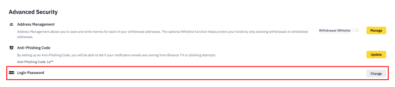 You can reset your account password from the Binance TH website or App. Please note that for security reasons, withdrawals and applications will be disabled for 24 hours after resetting your password.