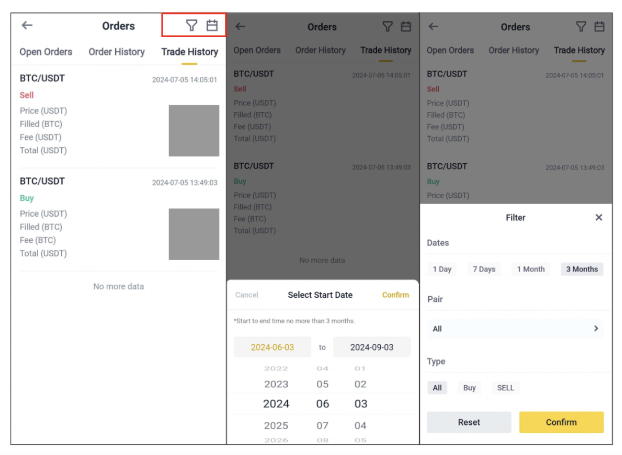 Tap the [Filter] button to specify the time period, trading pair, and transaction type for which you wish to view data.
