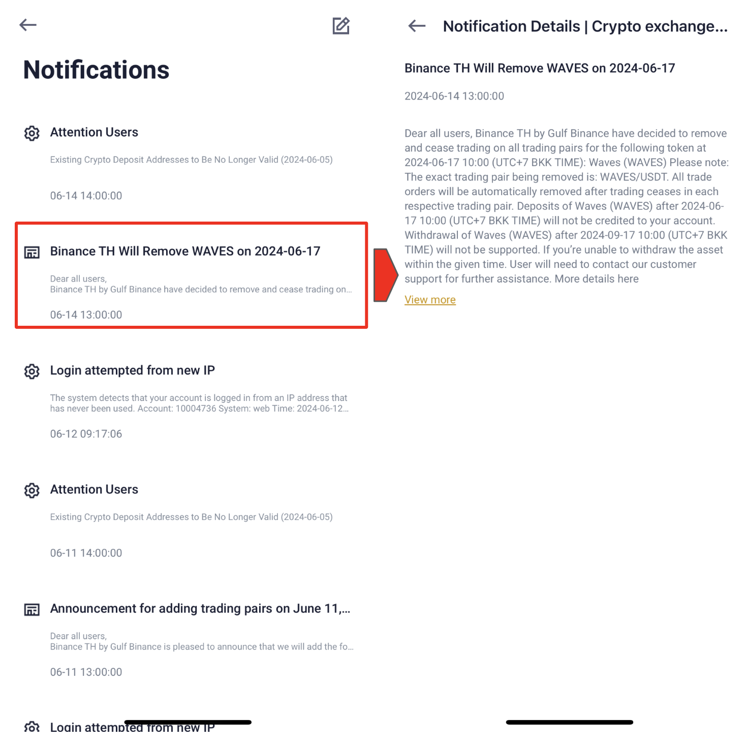 Binance TH will post the delisting announcement for a token/trading pair to notify users. If you hold the specific token in your Spot Wallet, you will be notified via the Binance TH App and receive an announcement in your registered email as well.