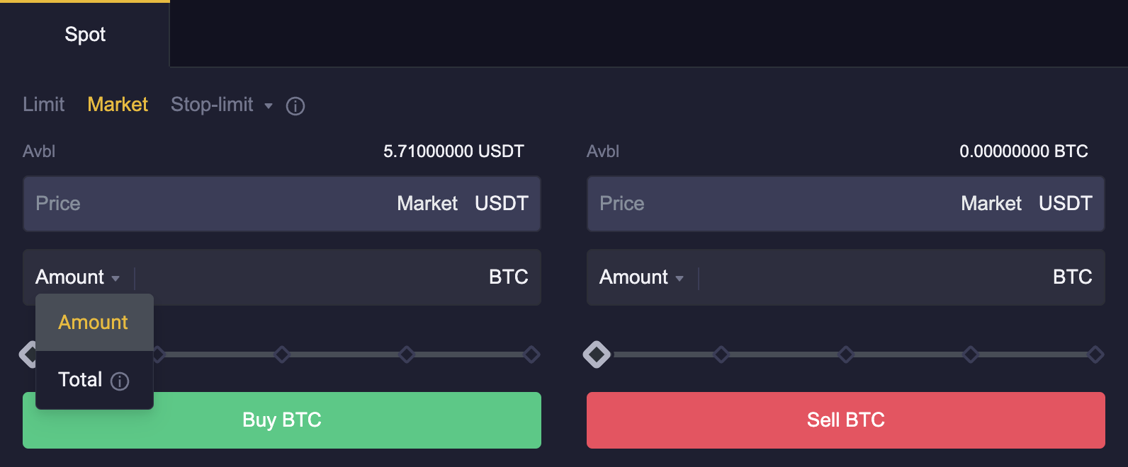 You can select [Amount] or [Total] to place a buy or sell market order. For example, you can enter the amount directly if you want to buy a certain quantity of BTC. But if you want to buy BTC with a certain amount of funds, such as 10,000 USDT, you can use [Total] to place the buy order.