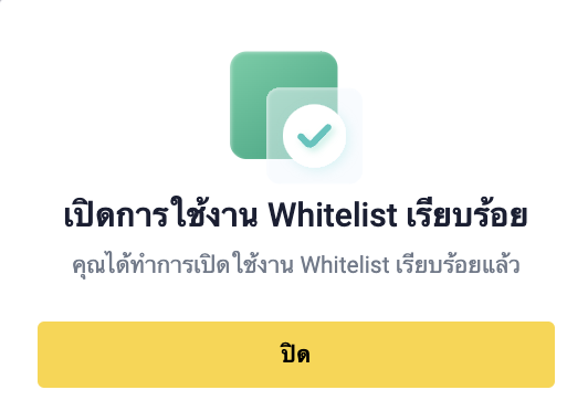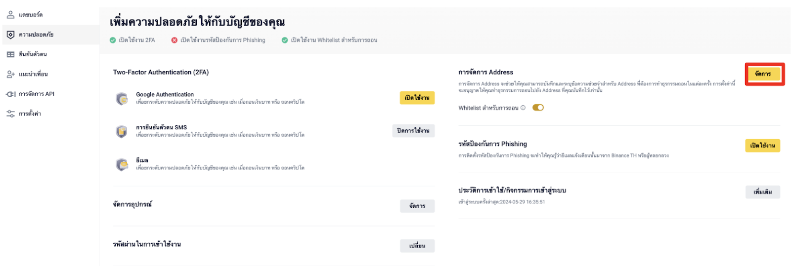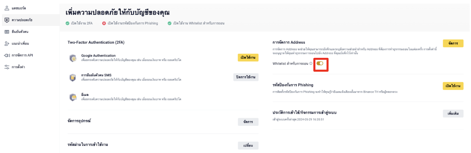 คุณสามารถเปิดใช้งานฟังก์ชันรายการที่อนุญาตพิเศษในการถอนเพื่อรักษาความปลอดภัยทรัพย์สินและบัญชีของคุณ หลังจากเปิดใช้งานแล้ว บัญชี BINANCE TH ของคุณจะสามารถทำรายการถอนสินทรัพย์ดิจิทัลออกไปยังที่อยู่ใน whitelist ได้
