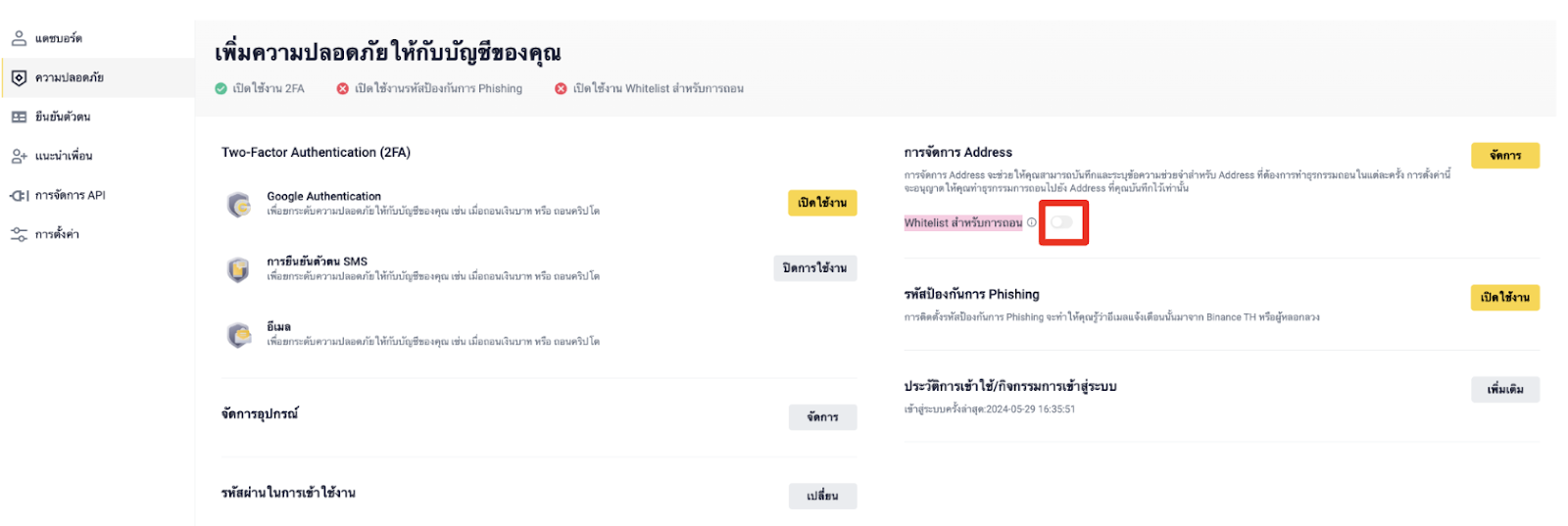 2. เลื่อนไปที่การจัดการ Address คลิก [ปุ่มสลับเปิด-ปิด] ถัดจาก Whitelist สำหรับการถอน