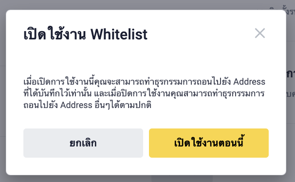 หมายเหตุ: เมื่อคุณเปิดใช้งานฟังก์ชัน whitelist สำหรับการถอน บัญชีของคุณจะสามารถถอนออกไปยังที่อยู่การถอนสินทรัพย์ที่อนุญาตพิเศษเท่านั้น เมื่อคุณปิดฟังก์ชันนี้ บัญชีของคุณจะสามารถถอนออกไปยังที่อยู่การถอนใดๆ ก็ได้