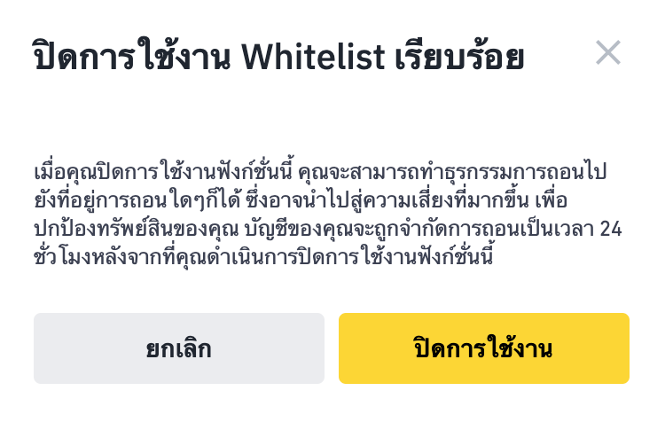 โปรดทราบว่าเมื่อคุณปิดฟังก์ชัน Whitelist สำหรับการถอน คุณจะสามารถถอนออกไปยังที่อยู่ใดก็ได้ เพื่อปกป้องทรัพย์สินของคุณ บัญชีของคุณจะถูกจำกัดการถอนเป็นเวลา 24 ชั่วโมงหลังจากที่คุณดำเนินการปิดฟังก์ชั่นนี้