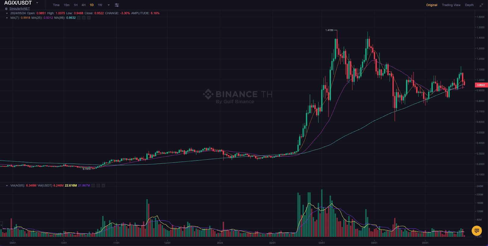 ปัจจุบัน AGIX ก็ยังไม่เคยกลับไปถึงราคาเดิมได้อีกเลย และเคยร่วงไปถึง 0.1 USDT ช่วงเดือนมีนาคม-พฤษภาคม 2020 ราคาปัจจุบัน ณ วันที่ 24 พฤษภาคม 2024 อยู่ที่ 0.9522 USDT Market cap 1.269 พันล้านดอลลาร์