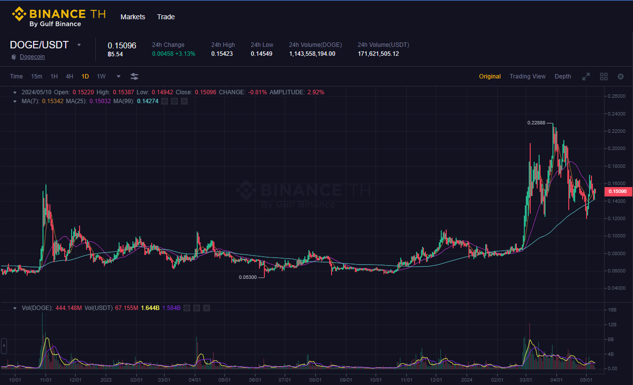 ในช่วงต้นปี 2021 Dogecoin มีการซื้อขายที่ราคา 0.0013 USDT ก่อนที่จะพุ่งขึ้นและแตะจุดสูงสุดที่ 0.73995 USDT ภายใน 5 เดือน ซึ่งนับเป็นกับการเพิ่มขึ้นถึง 560 เท่า อย่างไรก็ตาม หนึ่งปีต่อมาในช่วงเดือนพฤษภาคม 2022 ราคาเหรียญ DOGE ก็ได้ปรับตัวลดลงและมีการซื้อขายที่ราคา ประมาณ 0.1 USDT ซึ่งคิดเป็นการลดลงกว่า 86% (Source: Binance TH trading chart)