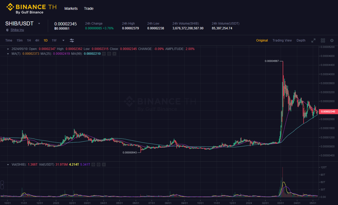 ราคาเหรียญ Shiba Inu ในอดีตมีความผันผวนเป็นอย่างมาก ในช่วงต้นกันยายน ของปี 2021 SHIB มีการซื้อขายที่ราคา 0.000006 USDT ก่อนที่จะพุ่งขึ้นและแตะจุดสูงสุดที่ 0.00008854 USDT ภายใน 1 เดือน ซึ่งนับเป็นกับการเพิ่มขึ้นถึง 14 เท่า อย่างไรก็ตาม ในระยะเวลา 8 เดือน ราคาเหรียญ SHIB ก็ได้ปรับตัลตัวตัวลดลงกว่า 90% และมีการซื้อขายที่ราคา ประมาณ 0.00001 USDT (Source: Binance TH trading chart) นักลงทุนควรตระหนักถึงความเสี่ยงก่อนที่จะลงทุน