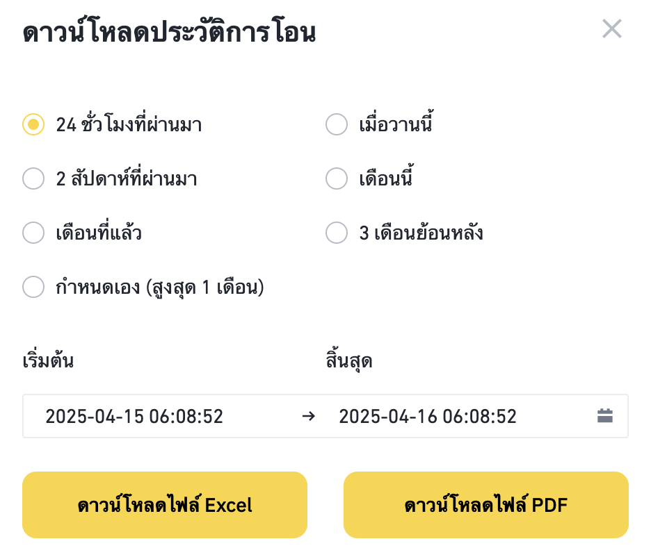1.3 เลือกประเภทไฟล์ที่ต้องการ (PDF หรือ Excel) และช่วงวันที่ของข้อมูลที่คุณต้องการดาวน์โหลด