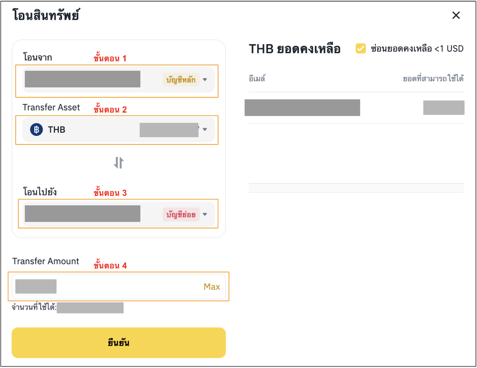 1.2 เลือกบัญชีต้นทางและบัญชีปลายทางที่ต้องการโอน จากนั้นเลือกสินทรัพย์ที่ต้องการโอนและกรอกจำนวนหรือคลิก [Max]