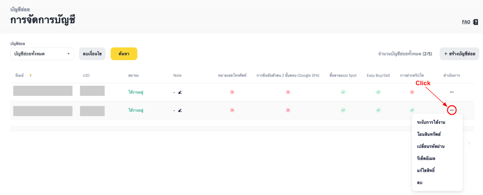 กำหนดสิทธิ์ของบัญชีย่อย สำหรับซื้อขายแบบ Spot, easy buy/sell หรือการฝากคริปโต