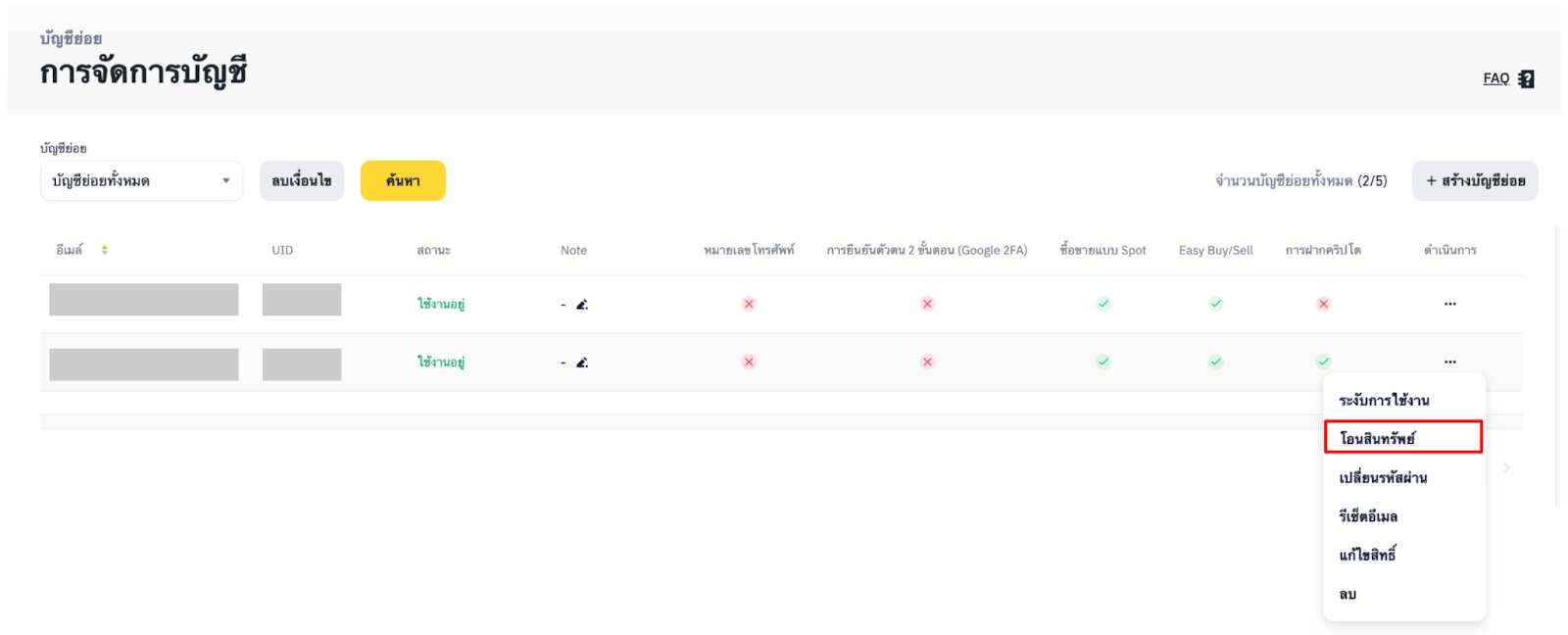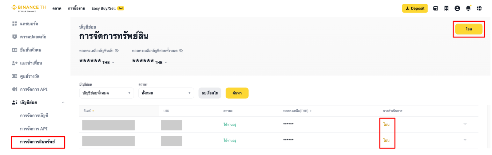 คุณสามารถดูยอดคงเหลือของบัญชีหลักและบัญชีย่อย ทั้งหมดได้ที่แท็บ [การจัดการสินทรัพย์] นอกจากนี้ยังสามารถโอนสินทรัพย์ระหว่างบัญชีหลักและบัญชีย่อย ได้ทันทีโดยไม่มีค่าธรรมเนียม