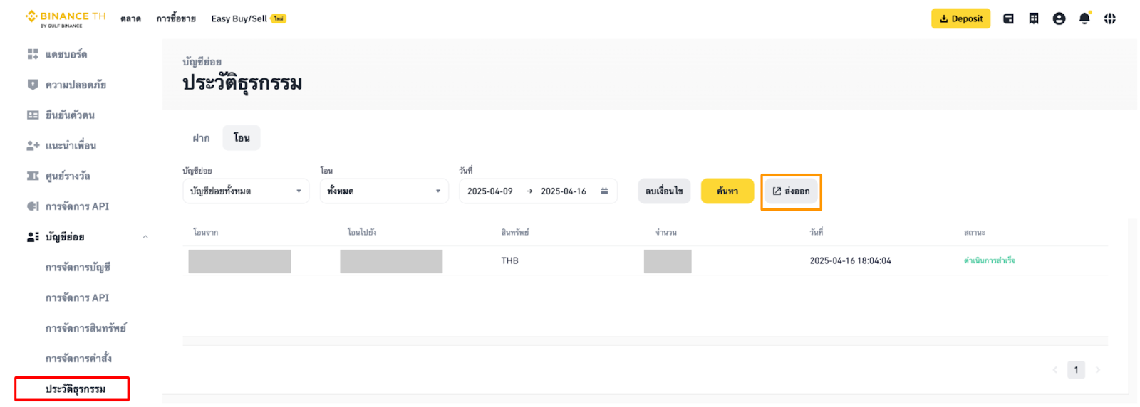 คุณสามารถดูประวัติการฝากหรือโอนของบัญชีย่อยทั้งหมดได้ที่ [ประวัติธุรกรรม] สำหรับการส่งออกประวัติการฝากหรือโอนสินทรัพย์ คลิก [ส่งออก] แล้วเลือกประเภทไฟล์ที่ต้องการ (PDF หรือ Excel) และช่วงวันที่ของข้อมูลที่คุณต้องการส่งออก