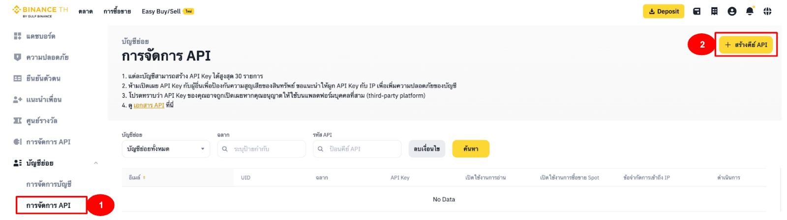 ไปที่แท็บ [การจัดการ API] เพื่อสร้างและแก้ไข API Keys และการเข้าถึง API ของบัญชีย่อยโดยแต่ละบัญชีสามารถสร้าง API Keys ได้สูงสุด 30 รายการ ซึ่งสามารถใช้ในการวางคำสั่ง, การสอบถาม, การตรวจสอบตำแหน่ง ฯลฯ ผ่านอินเทอร์เฟซ API สาธารณะของบัญชีย่อย
