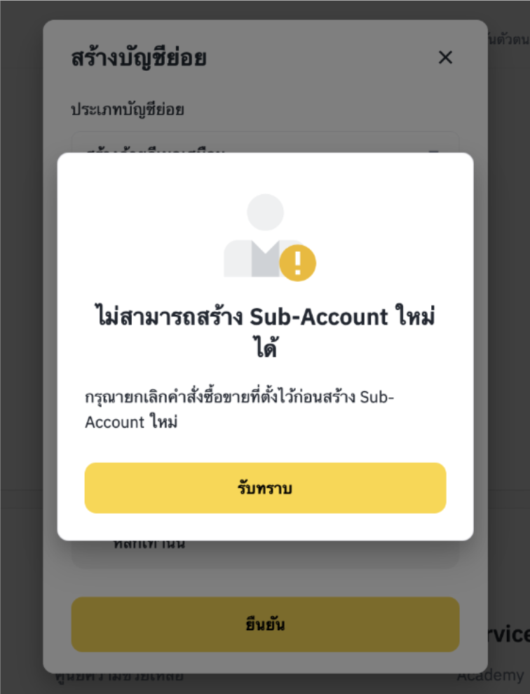 หมายเหตุ: ก่อนดำเนินการลบบัญชีย่อย โปรดตรวจสอบให้แน่ใจว่าไม่มีคำสั่งซื้อขายเปิดอยู่, สินทรัพย์คงเหลือ, หรือคีย์ API ที่ผูกกับบัญชี