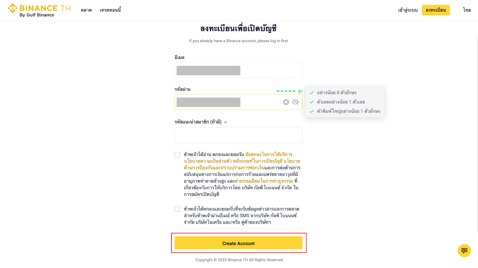 หากคุณได้รับการแนะนำจากเพื่อนให้ลงทะเบียนกับ BINANCE TH อย่าลืมกรอกรหัสผู้อ้างอิง (ไม่บังคับ)