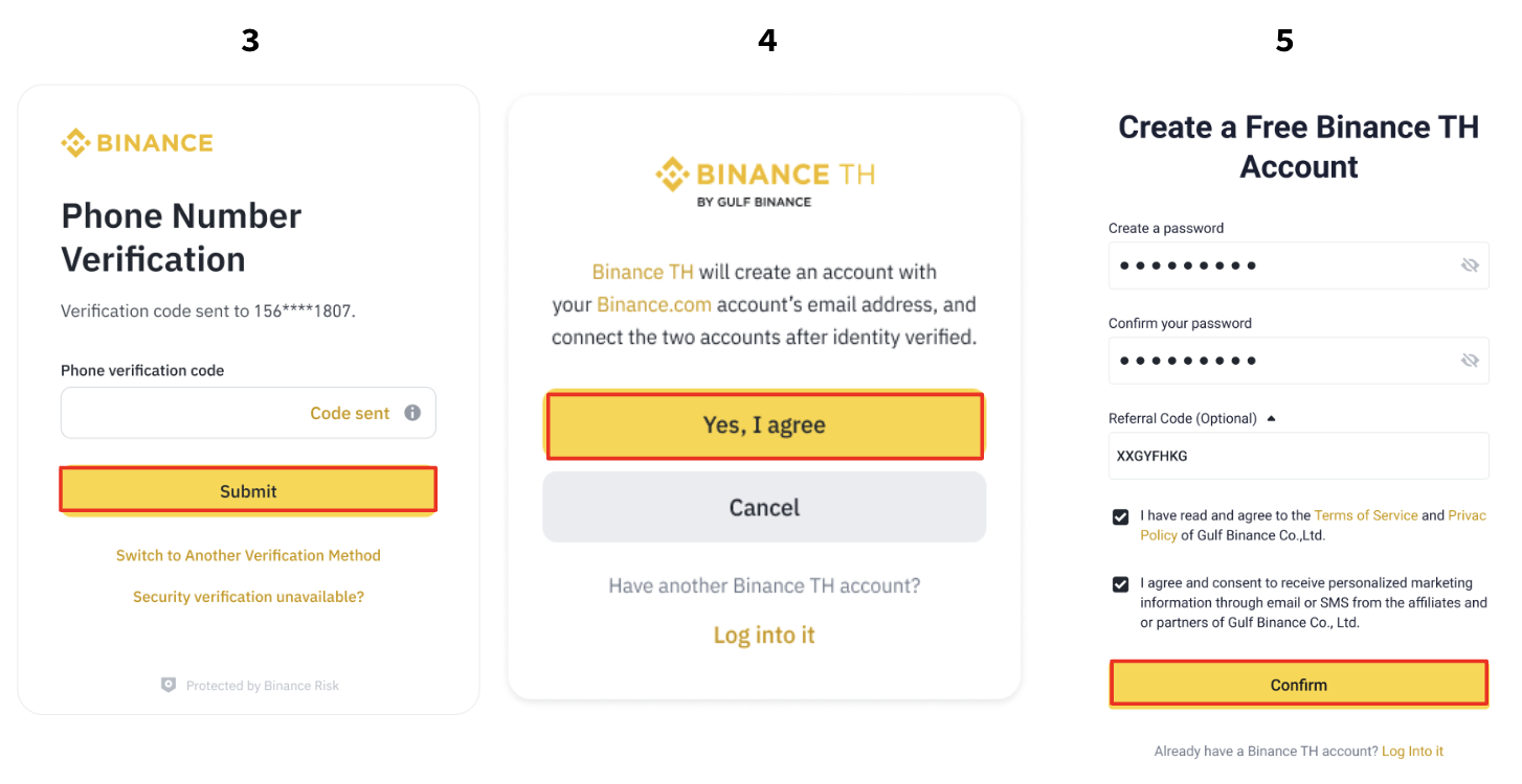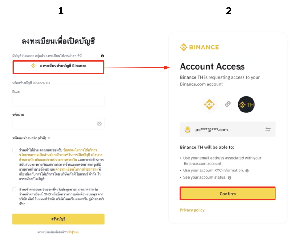 หมายเหตุ: BINANCE TH จะใช้ที่อยู่อีเมล หมายเลขโทรศัพท์ และข้อมูล KYC ที่เชื่อมโยงกับบัญชี Binance.com ของคุณ