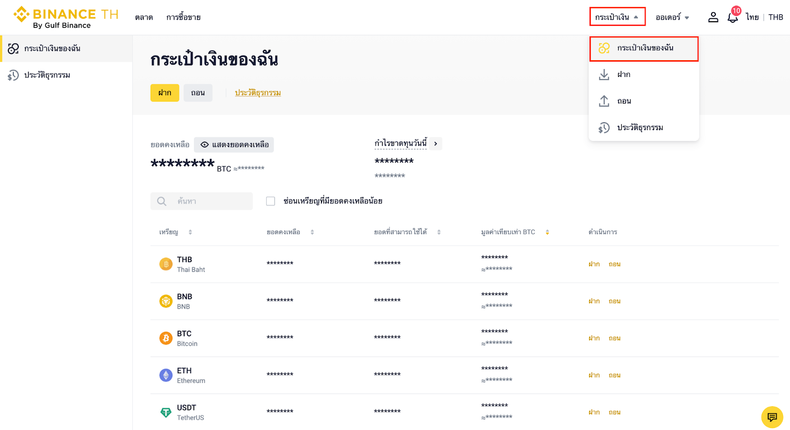 คุณสามารถตรวจสอบยอดคงเหลือทั้งหมดในบัญชี Binance TH ของคุณได้จากหน้า [กระเป๋าเงิน - กระเป๋าเงินของฉัน]