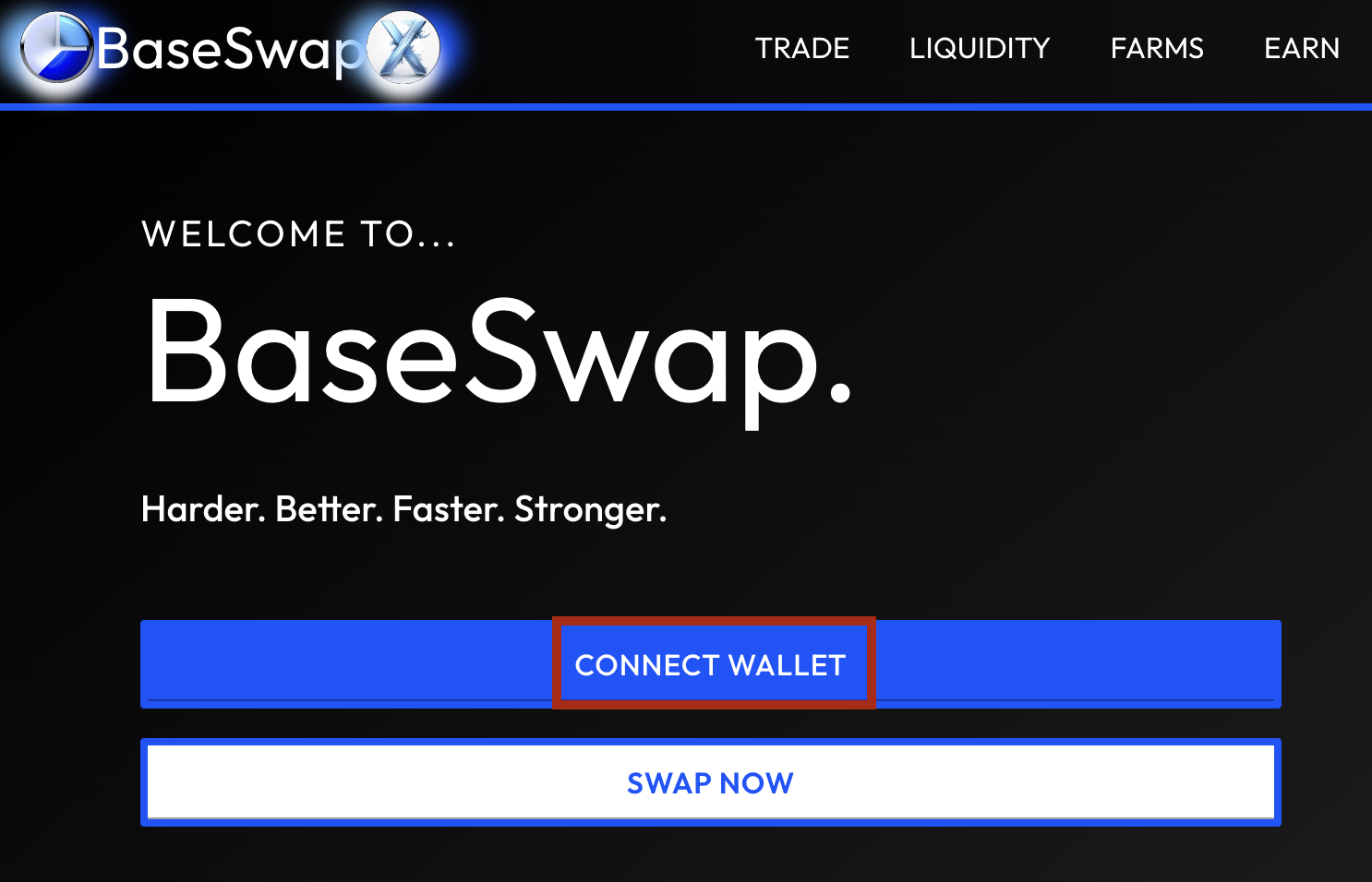 1.2. เชื่อมต่อแอปพลิเคชันด้วยการใช้กระเป๋า Coinbase Wallet (ในรูปตัวอย่างเป็น BaseSwap)