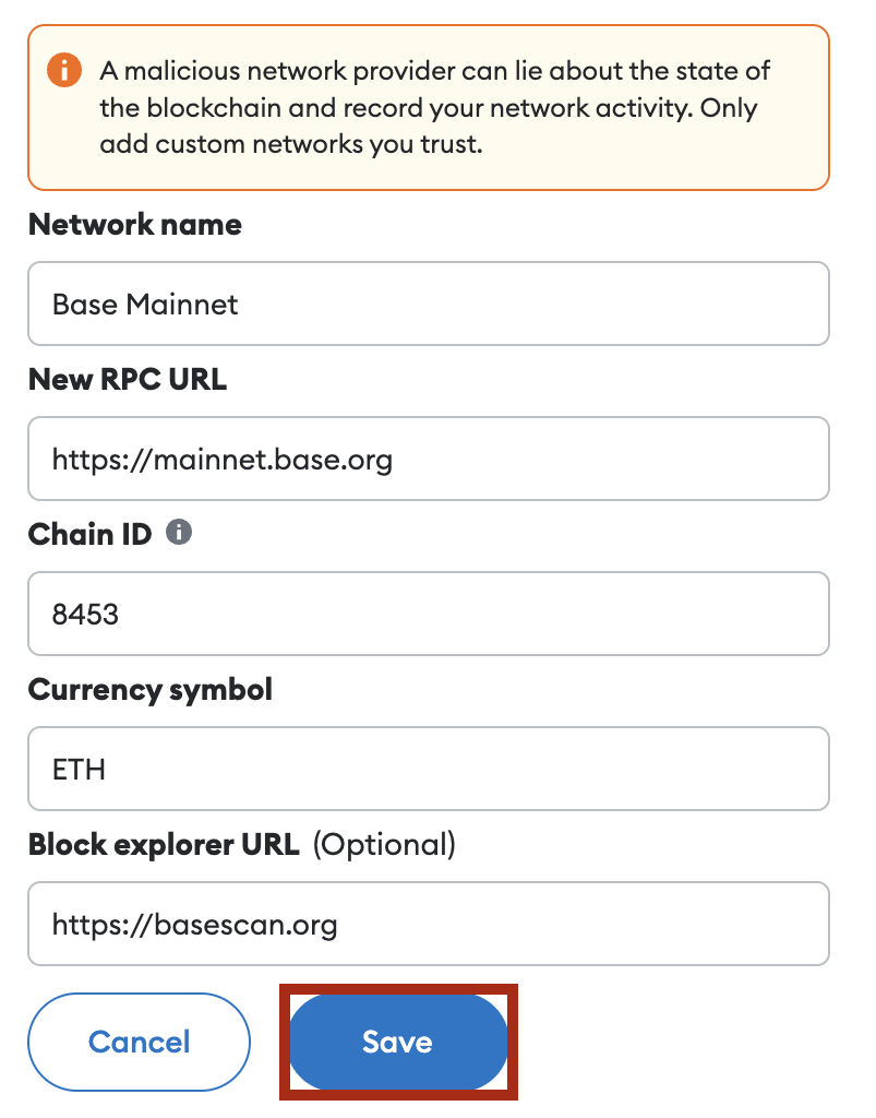 5. ในหน้า “เพิ่มเครือข่ายด้วยตนเอง” ให้กรอกรายละเอียดของ Base Goerli testnet แล้วกดบันทึก