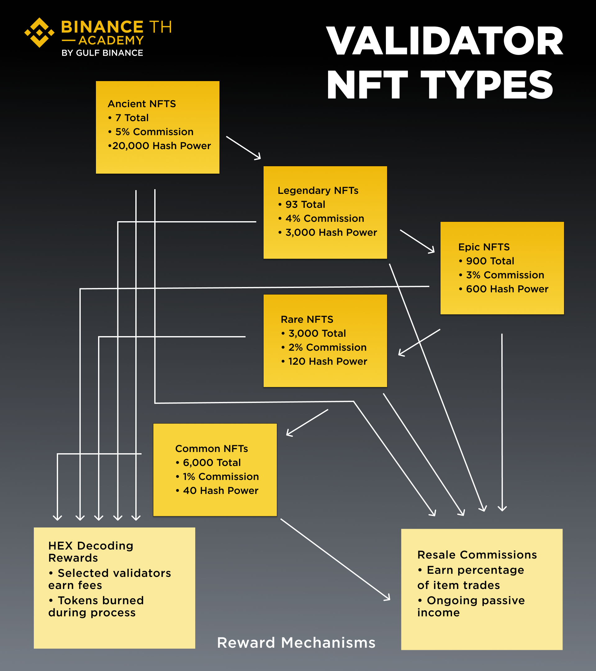 ตามข้อมูลจากเว็บไซต์ทางการ มี Validator NFTs อยู่ 5 ประเภท แต่ละประเภทจะมีระดับพลัง (Power Level), อัตราค่าคอมมิชชั่นในการขายต่อ (Commission Rate), และค่าแฮชพาวเวอร์ (Hash Power) ที่แตกต่างกัน ยิ่งเป็น NFT ระดับสูง โอกาสถูกเลือกให้ทำธุรกรรมถอดรหัสก็สูงขึ้น