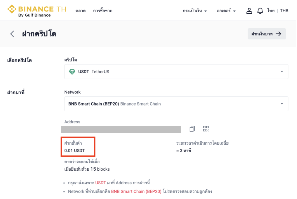 ตัวอย่างเช่น คุณต้องการฝาก USDT ด้วยเครือข่าย BSC ทั้งนี้ยอดฝากขั้นต่ำของคุณคือ 0.01USDT