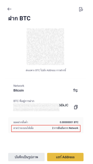 ตัวอย่าง เมื่อต้องการฝาก BTC บน Network Bitcoin