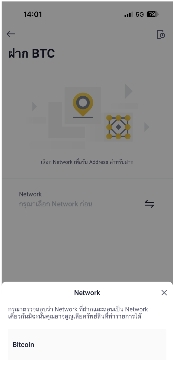 การเลือก Network ขึ้นอยู่กับตัวเลือกที่สามารถเลือกได้จากกระเป๋าเงิน/ศูนย์ซื้อขาย-แลกเปลี่ยนภายนอกที่คุณทำการถอนออกด้วย ตัวอย่างเช่น หากแพลตฟอร์มภายนอกรองรับเฉพาะ ERC20 คุณต้องเลือก Network การฝากเงินเป็น ERC20 เช่นกัน