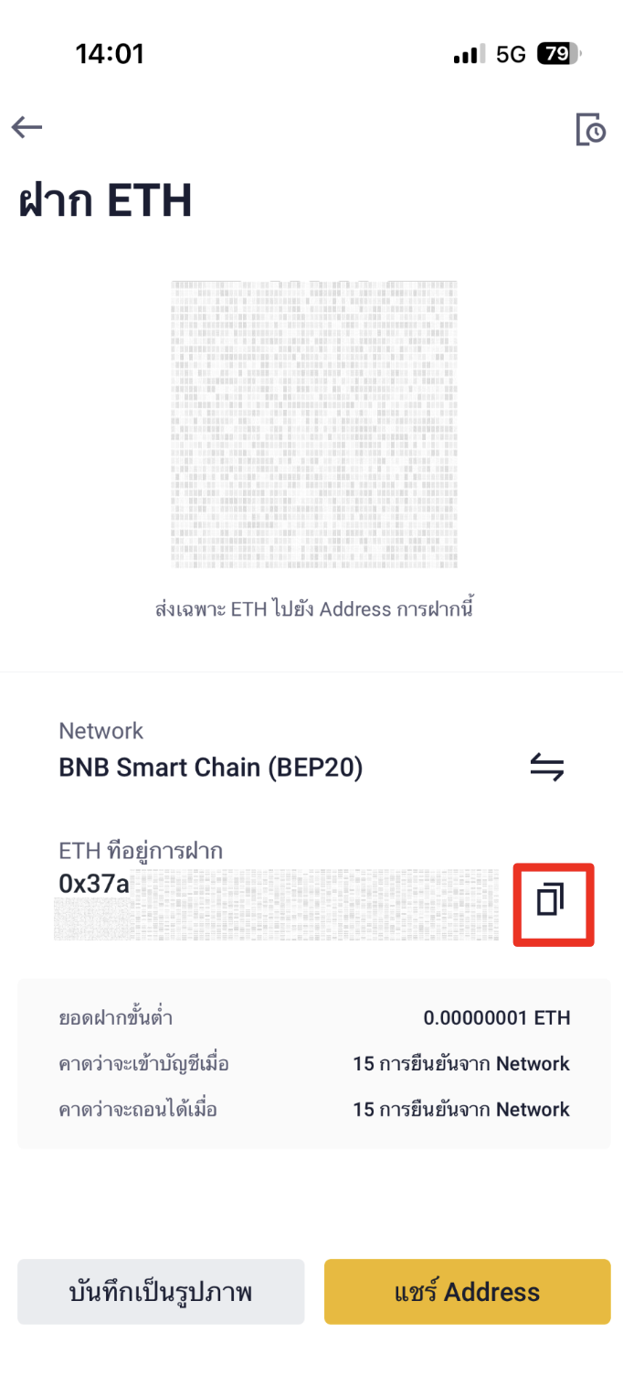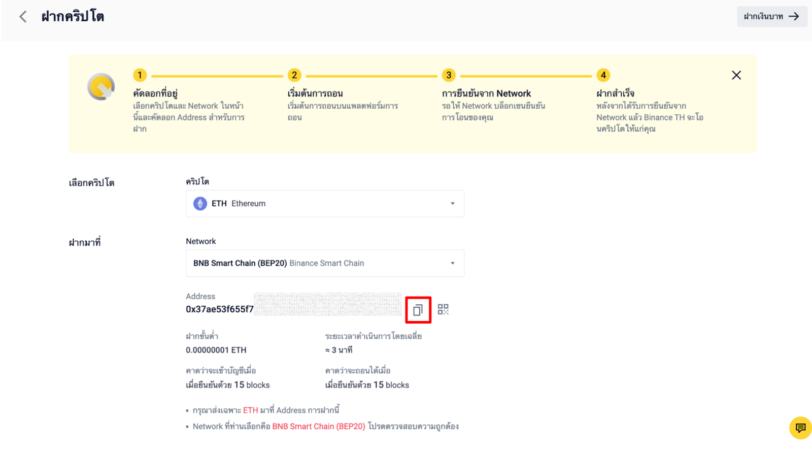 6. คลิก ไอคอนคัดลอก เพื่อคัดลอก Address การฝากของ BINANCE TH ของคุณและวางลงในช่อง Address บนแพลตฟอร์มที่คุณต้องการถอนคริปโต