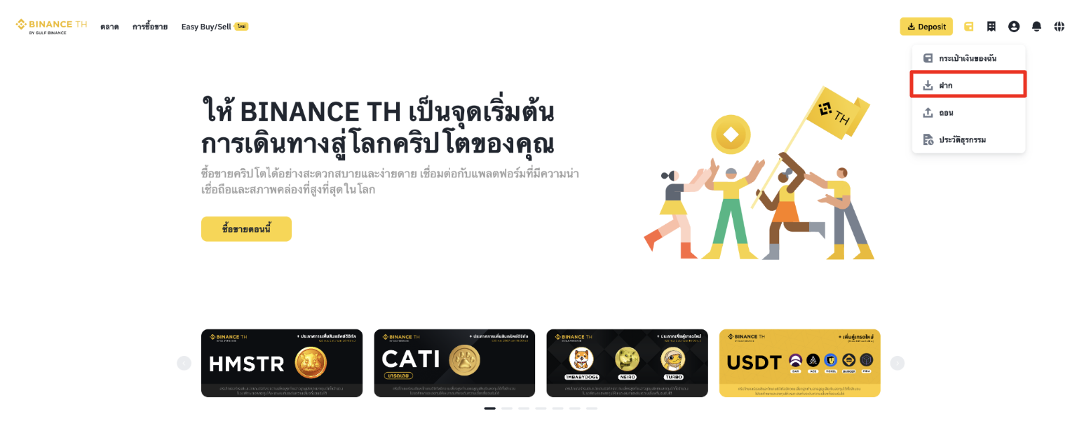 บนเว็บไซต์: เข้าสู่บัญชี BINANCE TH ของคุณแล้วคลิก [กระเป๋าเงิน] จากนั้นคลิก [ฝาก]