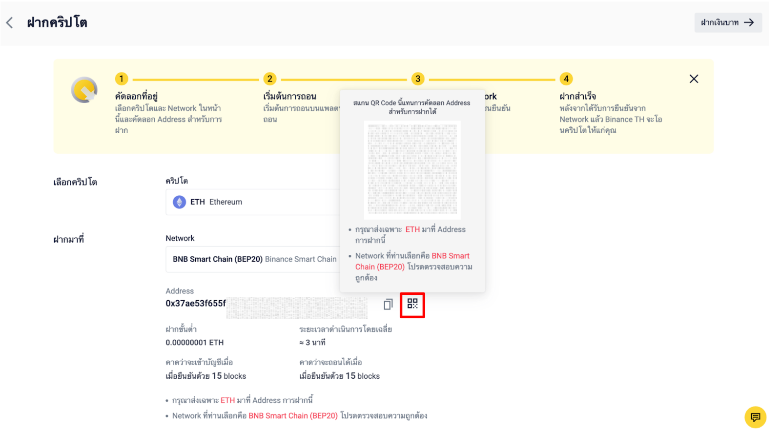คุณสามารถคลิกไอคอนรหัส QR เพื่อแสดง QR Code Address สำหรับนำไปใช้ในแพลตฟอร์มที่คุณกำลังถอนออก