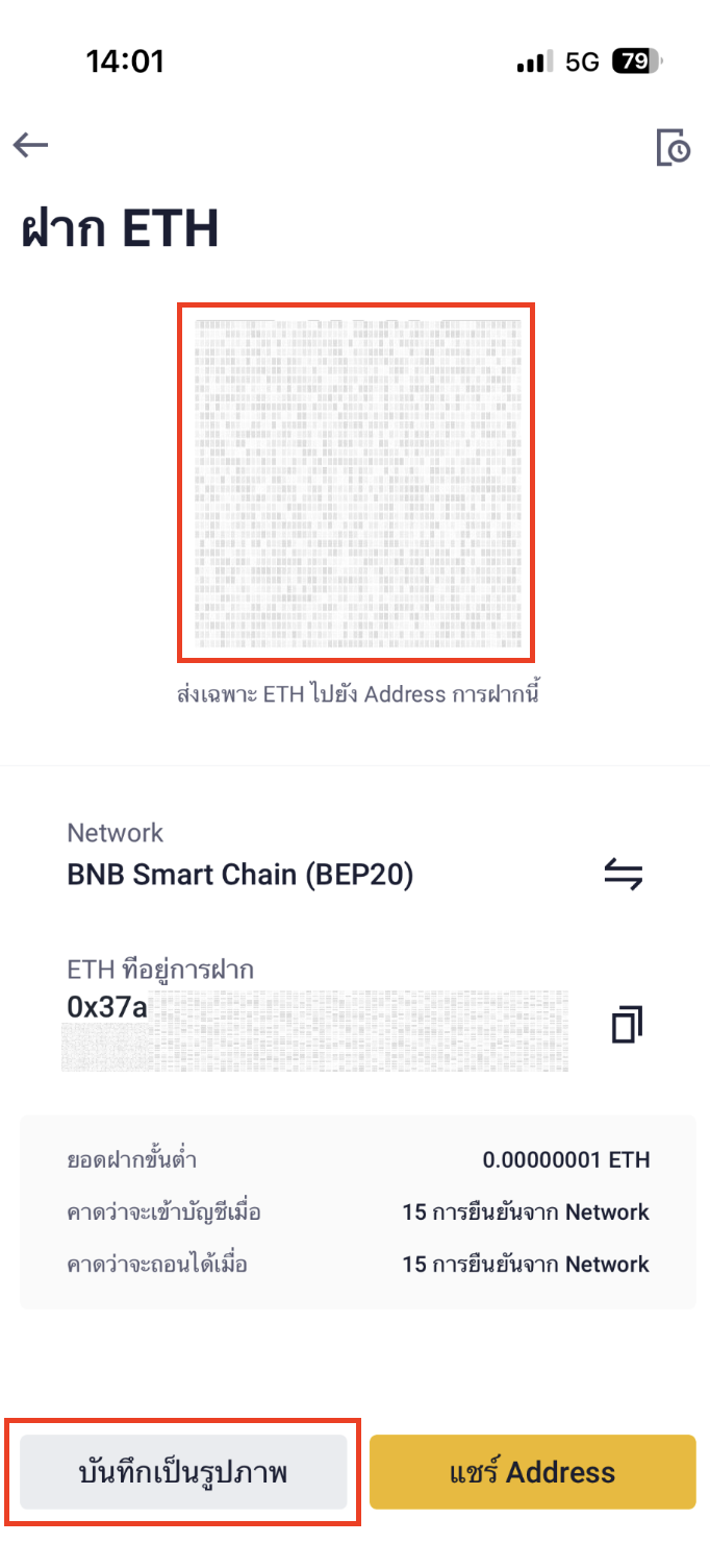 5. ในตัวอย่างนี้ เราจะถอน ETH จากแพลตฟอร์มอื่นและฝากเข้า BINANCE TH และเลือกใช้ Network BNB Smart Chain สำหรับการถอน ดังนั้นเราจะเลือก BNB Smart Chain (BEP20) สำหรับ Network การฝาก